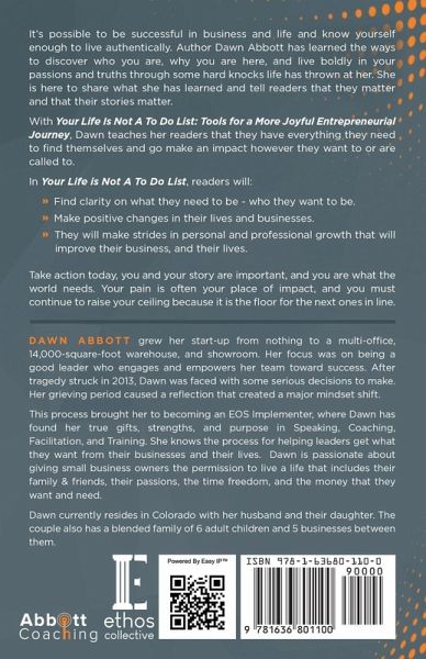 It's possible to be successful in business and life and know yourself enough to live authentically. Author Dawn Abbott has learned the ways to discover who you are, why you are here, and live boldly in your passions and truths through some hard knocks life has thrown at her. She is here to share what she has learned and tell readers that they matter and that their stories matter. With Your Life Is Not A To Do List: Tools for a More Joyful Entrepreneurial Journey, Dawn teaches her readers that they have everything they need to find themselves and go make an impact however they want to or are called to. In Your Life is Not A To Do List, readers will: - Find clarity on what they need to be - who they want to be. - Make positive changes in their lives and businesses. - They will make strides in personal and professional growth that will improve their business, and their lives. Take action today, you and your story are important, and you are what the world needs. Your pain is often your place of impact, and you must continue to raise your ceiling because it is the floor for the next ones in line.