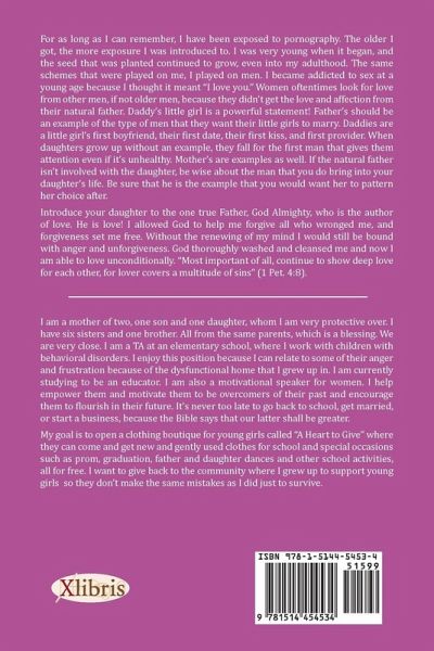 " For as long as I can remember, I have been exposed to pornography. The older I got, the more exposure I was introduced to. I was very young when it began, and the seed that was planted continued to grow, even into my adulthood. The same schemes that were played on me, I played on men. I became addicted to sex at a young age because I thought it meant ""I love you."" Women oftentimes look for love from other men, if not older men, because they didn't get the love and affection from their natural father. Daddy's little girl is a powerful statement! Father's should be an example of the type of men that they want their little girls to marry. Daddies are a little girl's first boyfriend, their first date, their first kiss, and first provider. When daughters grow up without an example, they fall for the first man that gives them attention even if it's unhealthy. Mother's are examples as well. If the natural father isn't involved with the daughter, be wise about the man that you do bring into your daughter's life. Be sure that he is the example that you would want her to pattern her choice after. Introduce your daughter to the one true Father, God Almighty, who is the author of love. He is love! I allowed God to help me forgive all who wronged me, and forgiveness set me free. Without the renewing of my mind I would still be bound with anger and unforgiveness. God thoroughly washed and cleansed me and now I am able to love unconditionally. ""Most important of all, continue to show deep love for each other, for lover covers a multitude of sins"" (1 Pet. 4:8)."