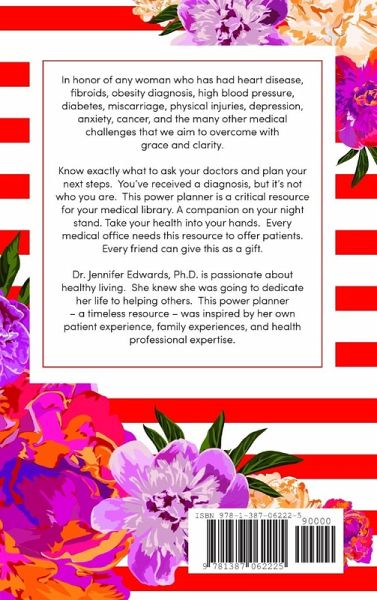 In honor of any woman who has had heart disease, fibroids, obesity diagnosis, high blood pressure, diabetes, miscarriage, physical injuries, depression, anxiety, cancer, and the many other medical challenges that we aim to overcome with grace and clarity. Know exactly what to ask your doctors and plan your next steps. You've received a diagnosis, but it's not who you are. This power planner is a critical resource for your medical library. A companion on your night stand. Take your health into your hands. Every medical office needs this resource to offer patients. Every friend can give this as a gift. This power planner - a timeless resource - was inspired by Dr. Edwards' own patient experience, family experiences, and health professional expertise. It's hard cover, purse-sized, and packed with more content than you can imagine. Perfect for women, patients, provider offices, and hospitals.