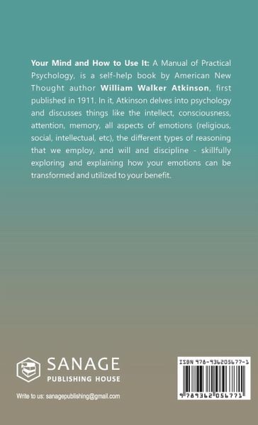 Your Mind and How to Use It: A Manual of Practical Psychology, is a self-help book by American New Thought author William Walker Atkinson, first published in 1911. In it, Atkinson delves into psychology and discusses things like the intellect, consciousness, attention, memory, all aspects of emotions (religious, social, intellectual, etc), the different types of reasoning that we employ, and will and discipline - skillfully exploring and explaining how your emotions can be transformed and utilized to your benefit.