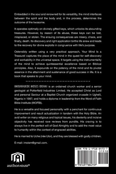 Embedded in the soul and renowned for its versatility, the mind interfaces between the spirit and the body and, in the process, determines the outcome of the twosome. It operates optimally on divinely gifted keys, which unlocks its abounding treasures. However, by reason of its abuse, these keys can be lost, misplaced, or stolen. The ensuing consequences are misery, chaos, and finally, death. Its discovery and right application births life anew and leads to the recovery for divine exploits in congruence with life's purpose. Ostensibly written using a very practical approach, Your Mind Is a Treasure! captures the place of the mind in the quest for self-discovery and workability in the universal space. It targets using the instrumentality of the mind to achieve quintessential excellence based on biblical principles. Also, it expounds on the potency of the mind and its pivotal essence in the attainment and sustenance of good success in life. It is a book that speaks to your mind.