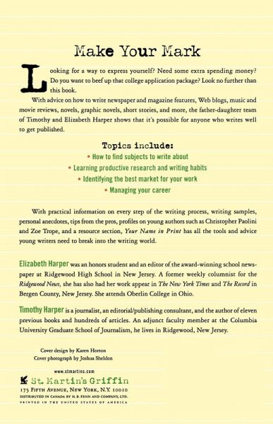 Make Your Mark Looking for a way to express yourself? Need some extra spending money? Do you want to beef up that college application package? Look no further than this book. With advice on how to write newspaper and magazine features, Web blogs, music and movie reviews, novels, graphic novels, short stories, and more, the father-daughter team of Timothy and Elizabeth Harper shows that it's possible for anyone who writes well to get published. Topics include: · How to find subjects to write about · Learning productive research and writing habits · Identifying the best market for your work · Managing your career · And so much more With practical information on every step of the writing process, writing samples, personal anecdotes, tips from the pros, profiles on young authors such as Christopher Paolini and Zoe Trope, and a resource section, Your Name in Print has all the tools and advice young writers need to break into the writing world.
