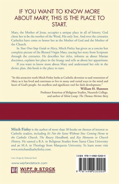 IF YOU WANT TO KNOW MORE ABOUT MARY, THIS IS THE PLACE TO START. Mary, the Mother of Jesus, occupies a unique place in all of history. God chose her to be the mother of the Word, His only Son. And over the centuries Catholics have come to honor her as the Mother of God and the Mother of the Church. In Your One-Stop Guide to Mary, Mitch Finley has given us a concise but complete picture of the Blessed Virgin Mary, tracing her story from Scripture through the centuries. He describes her titles, informs us about Marian doctrines, explains her place in the liturgy and tells us about her apparitions. If you want to know more about Mary and understand her role in the divine plan, this book is the place to start.