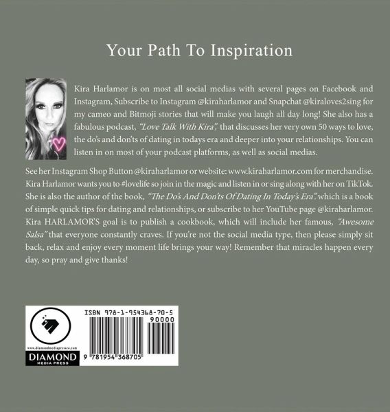 Kira Harlamor is on most all social medias with several pages on Facebook and Instagram, Subscribe to Instagram @kiraharlamor and Snapchat @kiraloves2sing for my cameo and Bitmoji stories that will make you laugh all day long! She also has a fabulous podcast, "Love Talk With Kira", that discusses her very own 50 ways to love, the do's and don'ts of dating in todays era and deeper into your relationships. You can listen in on most of your podcast platforms, as well as social medias. See her Instagram Shop Button @kiraharlamor or website: www.kiraharlamor.com for merchandise. Kira Harlamor wants you to #lovelife so join in the magic and listen in or sing along with her on TikTok. She is also the author of the book, "The Do's And Don'ts Of Dating In Today's Era". which is a book of simple quick tips for dating and relationships, or subscribe to her YouTube page @kiraharlamor. Kira HARLAMOR'S goal is to publish a cookbook, which will include her famous, "Awesome Salsa" that everyone constantly craves. If you're not the social media type, then please simply sit back, relax and enjoy every moment life brings your way! Remember that miracles happen every day, so pray and give thanks!