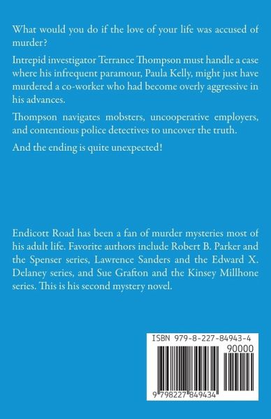 What would you do if the love of your life was accused of murder? Intrepid investigator Terrance Thompson must handle a case where his infrequent paramour, Paula Kelly, might just have murdered a co-worker who had become overly aggressive in his advances. Thompson navigates mobsters, uncooperative employers, and contentious police detectives to uncover the truth. And the ending is quite unexpected!