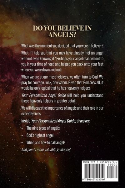 Your Personalized Angel Guide Do you believe in angels? What was the moment you decided that you were a believer? What if I told you that you may have already met an angel without even knowing it? Perhaps your angel reached out to you in your time of need and helped you back onto your feet when you were down and out. When we are at our most helpless, we often turn to God. We pray for courage, luck, or wisdom. Given that God sees all, it would be only logical that he has heavenly helpers. Your Personalized Angel Guide will help you understand these heavenly helpers in greater detail. We will discuss the importance of angels and their role in our everyday lives. Inside Your Personalized Angel Guide, discover: The nine types of angels God's highest angel When and how to call angels And plenty more valuable guidance! Don't waste another minute! Grab a copy of Your Personalized Angel Guide and start your journey to enlightenment today.