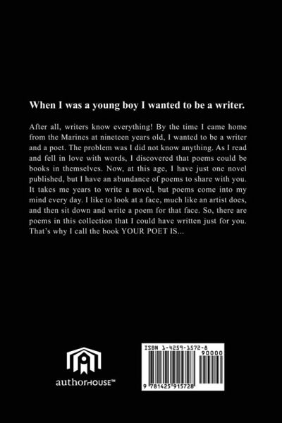 When I was a young boy I wanted to be a writer. After all, writers know everything! By the time I came home from the Marines at nineteen years old, I wanted to be a writer and a poet. The problem was I did not know anything. As I read and fell in love with words, I discovered that poems could be books in themselves. Now, at this age, I have just one novel published, but I have an abundance of poems to share with you. It takes me years to write a novel, but poems come into my mind every day. I like to look at a face, much like an artist does, and then sit down and write a poem for that face. So, there are poems in this collection that I could have written just for you. That''s why I call the book YOUR POET IS...