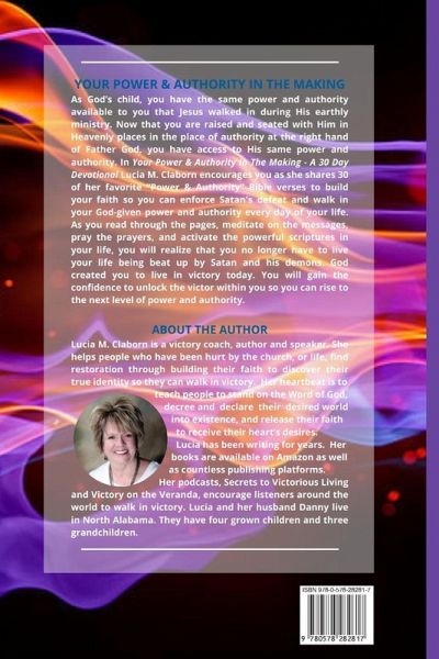 In Your Power & Authority In The Making - A 30 Day Devotional Lucia M. Claborn encourages you as she shares 30 of her favorite "Power & Authority" Bible verses to build your faith so you can enforce Satan's defeat and walk in your God-given power and authority every day of your life. As God's child, you have the same power and authority available to you that Jesus walked in during His earthly ministry. Now that you are raised and seated with Jesus in Heavenly places in the place of authority at the right hand of Father God, you have full access to His power and authority as a part of your Covenant rights. As you read through the pages, meditate on each message, pray the prayers, and activate the powerful scriptures in your life, you will realize that you no longer have to live your life being beat up by Satan and his demons. God created you to live in victory today. You will gain the confidence to unlock the victor within you so you can rise to the next level of power and authority in your life.