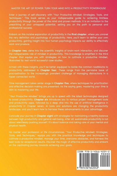 Master the Art of Power: Turn Your Mind into A Productivity Powerhouse Enter a journey of self-discovery with "Your Productive Mindset: Strategies, Tools, and Techniques." This book serves as your indispensable guide to achieving limitless productivity through the power of the mind and proven methods. It is an invitation to the unearthing of your untapped potential, setting you on the path to personal and professional success. Embark on this incisive exploration of productivity in the first chapter, where you unravel the very definition and psychology of productivity. Here, you'll learn to define your own productivity, gaining insight into how human psychology impacts our ability to effectively work and produce. In Chapter two, delve into the scientific insights of brain-work interaction, and discover the indispensable role of mindset in productivity. This knowledge is amplified in the third chapter that equips you with strategies on how to cultivate a productive mindset, illustrated by real-world successful case studies. Armed with these insights, you'll be better equipped to tackle the common roadblocks to productivity addressed in Chapter four. These range from the pervasive issue of procrastination to the increasingly prevalent challenge of managing distractions in a hyper-connected world. Time management takes center stage in Chapter five, where techniques for prioritization and effective decision-making are presented. As the saying goes, mastering your time is akin to mastering your life. "Your Productive Mindset" brings you up to speed with the latest technologies designed to boost productivity. Chapter six introduces you to various project management tools and productivity apps, followed by a deep dive into the use of artificial intelligence in productivity in Chapter seven. AI tools and solutions are changing the productivity landscape, and you'll learn how to harness these advancements to your advantage. Conclude your journey in Chapter eight with strategies for maintaining a healthy balance between high productivity and general well-being. After all, sustainable productivity is not about relentlessly pushing yourself; it's about balance and taking care of your mental and physical health. No matter your profession or life circumstances, "Your Productive Mindset: Strategies, Tools, and Techniques," equips you with the practical knowledge and techniques to cultivate a productive mindset, manage your time, overcome obstacles, and harness the best tools for exceptional results. Discover the magic of effective productivity and embark on the captivating journey towards achieving your goals.