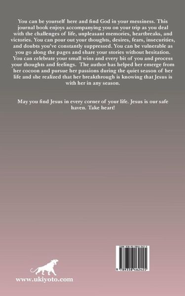 You can be yourself here and find God in your messiness. This journal book enjoys accompanying you on your trip as you deal with the challenges of life, unpleasant memories, heartbreaks, and victories. You can pour out your thoughts, desires, fears, insecurities, and doubts you've constantly suppressed. You can be vulnerable as you go along the pages and share your stories without hesitation. You can celebrate your small wins and every bit of you and process your thoughts and feelings. The author has helped her emerge from her cocoon and pursue her passions during the quiet season of her life and she realized that her breakthrough is knowing that Jesus is with her in any season. May you find Jesus in every corner of your life. Jesus is our safe haven. Take heart!