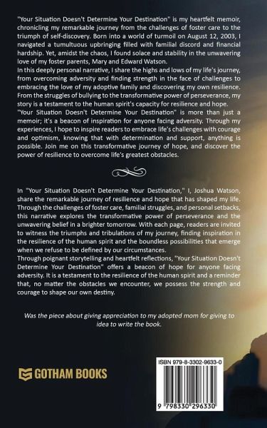 "Your Situation Doesn't Determine Your Destination" is my heartfelt memoir, chronicling my remarkable journey from the challenges of foster care to the triumph of self-discovery. Born into a world of turmoil on August 12, 2003, I navigated a tumultuous upbringing filled with familial discord and financial hardship. Yet, amidst the chaos, I found solace and stability in the unwavering love of my foster parents, Mary and Edward Watson. In this deeply personal narrative, I share the highs and lows of my life's journey, from overcoming adversity and finding strength in the face of challenges to embracing the love of my adoptive family and discovering my own resilience. From the struggles of bullying to the transformative power of perseverance, my story is a testament to the human spirit's capacity for resilience and hope. "Your Situation Doesn't Determine Your Destination" is more than just a memoir; it's a beacon of inspiration for anyone facing adversity. Through my experiences, I hope to inspire readers to embrace life's challenges with courage and optimism, knowing that with determination and support, anything is possible. Join me on this transformative journey of hope, and discover the power of resilience to overcome life's greatest obstacles.