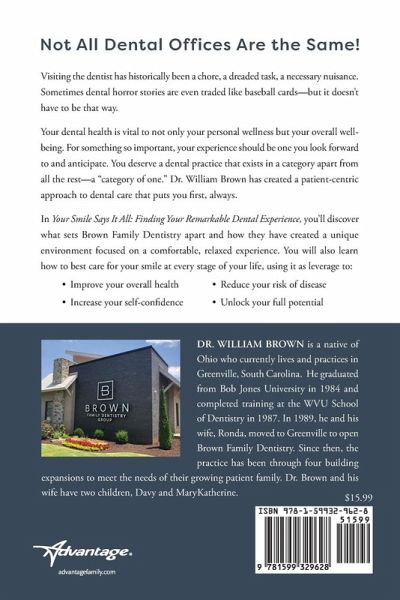 Not All Dental Offices Are the Same! Visiting the dentist has historically been a chore, a dreaded task, a necessary nuisance. Sometimes dental horror stories are even traded like baseball cards-but it doesn't have to be that way. Your dental health is vital to not only your personal wellness but your overall wellbeing. For something so important, your experience should be one you look forward to and anticipate. You deserve a dental practice that exists in a category apart from all the rest-a "category of one." Dr. William Brown has created a patient-centric approach to dental care that puts you first, always. In Your Smile Says It All: Finding Your Remarkable Dental Experience, you'll discover what sets Brown Family Dentistry apart and how they have created a unique environment focused on a comfortable, relaxed experience. You will also learn how to best care for your smile at every stage of your life, using it as leverage to: ¿ Improve your overall health ¿ Increase your self-confidence ¿ Reduce your risk of disease ¿ Unlock your full potential