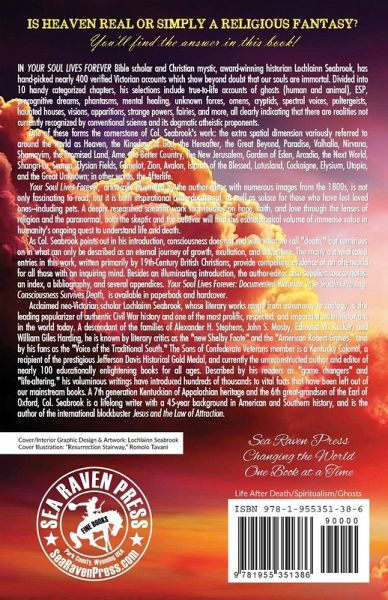 In Your Soul Lives Forever Bible scholar and Christian mystic, award-winning historian Lochlainn Seabrook, has hand-picked nearly 400 verified Victorian accounts which show beyond doubt that our souls are immortal. Divided into 10 handy categorized chapters, his selections include true-to-life accounts of ghosts (human and animal), ESP, precognitive dreams, phantasms, mental healing, unknown forces, omens, cryptids, spectral voices, poltergeists, haunted houses, visions, apparitions, strange powers, fairies, and more, all clearly indicating that there are realities not currently recognized by conventional science and its dogmatic atheistic proponents. One of these forms the cornerstone of Col. Seabrook's work: the extra spatial dimension variously referred to around the world as Heaven, the Kingdom of God, the Hereafter, the Great Beyond, Paradise, Valhalla, Nirvana, Shamayim, the Promised Land, Ame, the Better Country, the New Jerusalem, Garden of Eden, Arcadia, the Next World, Shangri-La, Svarga, Elysian Fields, Camelot, Zion, Avalon, Islands of the Blessed, Lotusland, Cockaigne, Elysium, Utopia, and the Great Unknown; in other words, the Afterlife. Your Soul Lives Forever, artistically illustrated by the author-editor with numerous images from the 1800s, is not only fascinating to read, but it is both inspirational and educational, as well as solace for those who have lost loved ones - including pets. A deeply researched scientific work that touches on hope, faith, and love through the lenses of religion and the paranormal, both the skeptic and the believer will find this eschatological volume of immense value in humanity's ongoing quest to understand life beyond the grave. As Col. Seabrook points out in his introduction, consciousness does not end with what we call "death," but continues on in what can only be described as an eternal journey of growth, exultation, and adventure. The many authenticated entries in this work, written primarily by 19th-Century British Christians, provide compelling evidence of an afterworld for all those with an inquiring mind. Besides an illuminating introduction, the author-editor also supplies source notes, an index, a bibliography, and several appendices. Your Soul Lives Forever: Documented Victorian Case Studies Proving Consciousness Survives Death, is available in paperback and hardcover. (All text copyright © Sea Raven Press) Award-winning historian Lochlainn Seabrook is the author and editor of nearly 100 books, including: Abraham Lincoln Was a Liberal, Jefferson Davis Was a Conservative; Jesus and the Law of Attraction; Lincoln's War: The Real Cause, the Real Winner, the Real Loser; Christ Is All and In All; Heroes of the Southern Confederacy: The Illustrated Book of Confederate Officials, Soldiers, and Civilians; Seabrook's Bible Dictionary of Traditional and Mystical Christian Doctrines; The Concise Book of Owls; The Great Yankee Coverup: What the North Doesn't Want You to Know About Lincoln's War; Confederacy 101: Amazing Facts You Never Knew About America's Oldest Political Tradition; The Martian Anomalies: A Photographic Search for Intelligent Life on Mars; Victorian Hernia Cures: Nonsurgical Self-Treatment of Inguinal Hernia; North America's Amazing Mammals: An Encyclopedia for the Whole Family; Support Your Local Confederate: Wit and Humor in the Southern Confederacy; Everything You Were Taught About American Slavery is Wrong, Ask a Southerner!; Mysterious Invaders: Twelve Famous 20th-Century Scientists Confront the UFO Phenomenon; Secrets of Celebrity Surnames: An Onomastic Dictionary of Famous People.