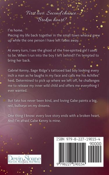 First love. Second chance. Broken heart? I'm home. Piecing my life back together in the small town where I grew up while the one person I have left fades away. At every turn, I see the ghost of the free-spirited girl I used to be. When I run into the boy I left behind? I'm tempted to bring her back. Gabriel Kenny, Sage Ridge's tattooed bad boy looking every inch a man as he laughs in my face and calls me his Achilles heel. Determined to pick up where we left off, he challenges me to release my inner wild child and offers me everything I ever wanted. But fate has never been kind, and loving Gabe paints a big, red, bullseye on my dreams. One thing I know: every love story ends with a broken heart. And I'm afraid Gabe Kenny is mine.