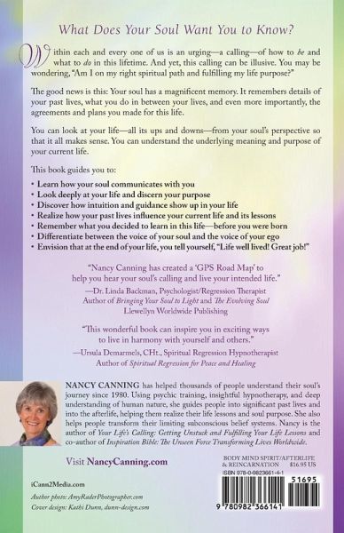 What does your soul want you to know? Within each and every one of us is an urging – a calling – of how to be and what to do in this lifetime. And yet, this calling can be illusive. You may be wondering, "Am I on my right spiritual path and fulfilling my life purpose?" The good news is this: Your soul has a magnificent memory. It remembers details of your past lives, what you do in between your lives, and even more importantly, the agreements and plans you made for this life. You can look at your life – all its ups and downs – from your soul’s perspective so that it all makes sense. You can understand the underlying meaning and purpose of your current life. This book guides you to: Learn how your soul communicates with you Look deeply at your life and discern your purpose Discover how intuition and guidance show up in your life Differentiate between the voice of your soul and the voice of your ego Remember what you decided to learn in this life – before you were born Realize how your past lives are influencing your current life and its lessons Ensure that at the end of your life, you will tell yourself: "life well lived, great job!" Nancy Canning is an expert in transforming patterns of behavior, and in the spiritual journey into past lives and the afterlife. She brings 35 years of work with clients into this book to help you understand your life from a higher perspective. You are given the opportunity to look into the ordinary, and not so ordinary, lives of clients. You witness their past lives and you hear the words of wisdom from their Guides and Spiritual Council of Elders in the afterlife. This gives you a front row seat to understanding how everything in their lives makes sense – and how to apply this perspective to your life as well. You can use the many tools and techniques described to discern your life lessons, your purpose, and most of all, how your soul is calling to you. From the Foreword, Bob Olson, author of Answers About the Afterlife: A Private Investigator’s 15-Year Research Unlocks the Mysteries of Life After Death, writes: "Nancy has taken the wisdom she’s gained from working with clients and having her own sacred experiences to help you discover your own soul’s purpose for being here. The result is this life-changing manual of life and purpose that I wish was available to me when I still felt lost and wandering without a sense of direction in my life. Whether you are just beginning your spiritual voyage or wanting to build upon years of insight and experience, you can expect many ‘Aha!’ moments while reading this book. I learned new truths and gained new tools from it, and I was also reminded of knowledge that I had previously learned but somehow forgotten. I have already utilized this book’s teachings in unexpected and valuable ways. I hope you share the same experience and allow the teachings within to expand and illuminate your life."