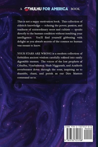 This is not a sappy motivation book. This collection of eldritch knowledge - echoing the power, passion, and madness of extraordinary seers and cultists - speaks directly to the human condition without insulting your intelligence. You'll find yourself gibbering with delight as you absorb secrets of the cosmos no human was meant to know. YOUR STARS ARE WRONG is a modern collection of forbidden ancient wisdom carefully refined into easily digestible memes. The voices of the lost prophets of Cthulhu, Nyarlathotep, Shub Niggurath, and Azathoth reverberates down through the eons, inspiring us to shamble, chant, and perish as our Dire Masters command us to. "Leave it to the Cthulhu Cult to put an end to the plague of pie-in-the-sky, feel-good, eat-love-pray genre of pabulum publications littering bookstore shelves." - Beretta Nova, Kingsport Star Herald