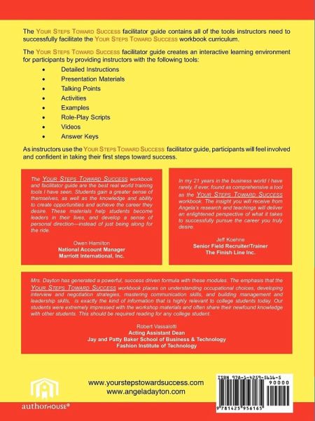 The YOUR STEPS TOWARD SUCCESS Facilitator Guide contains all of the tools instructors need to successfully facilitate the YOUR STEPS TOWARD SUCCESS Career Resource Workbook curriculum. The YOUR STEPS TOWARD SUCCESS Facilitator Guide creates an interactive learning environment for the participants by providing instructors with the following tools: Detailed Instructions Presentation Materials Talking Points Activities Examples Role-Play Scripts Videos Answer Keys As instructors use the YOUR STEPS TOWARD SUCCESS Facilitator Guide, participants will feel involved and confident in taking their first steps toward success.