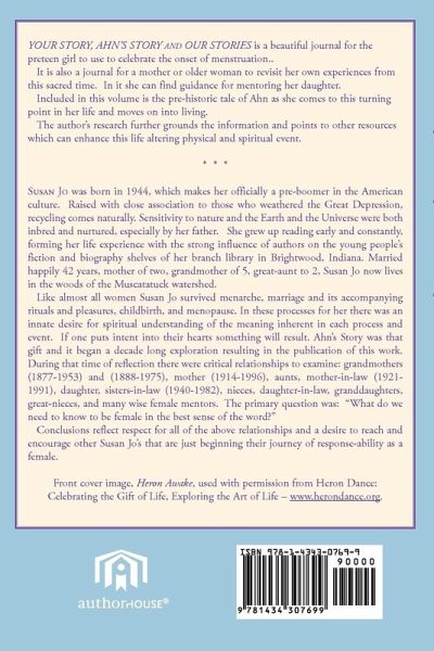YOUR STORY, AHN'S STORY and OUR STORIES is a beautiful journal for the preteen girl to use to celebrate the onset of menstruation.. It is also a journal for a mother or older woman to revisit her own experiences from this sacred time. In it she can find guidance for mentoring her daughter. Included in this volume is the pre-historic tale of Ahn as she comes to this turning point in her life and moves on into living. The author's research further grounds the information and points to other resources which can enhance this life altering physical and spiritual event.