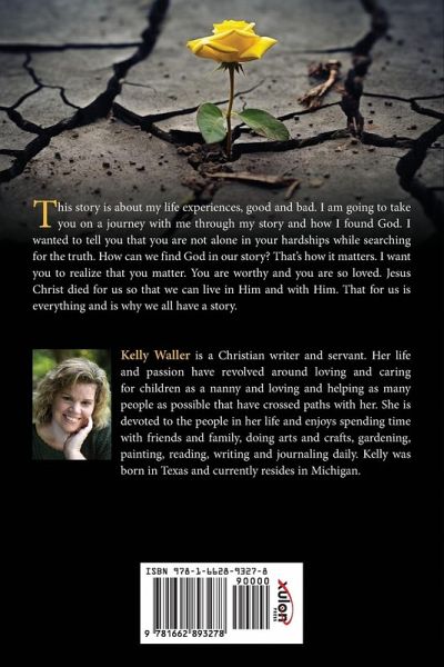 This story is about my life experiences, good and bad. I am going to take you on a journey with me through my story and how I found God. I wanted to tell you that you are not alone in your hardships while searching for the truth. How can we find God in our story? That's how it matters. I want you to realize that you matter. You are worthy and you are so loved. Jesus Christ died for us so that we can live in Him and with Him. That for us is everything and is why we all have a story. Kelly Waller is a Christian writer and servant. Her life and passion have revolved around loving and caring for children as a nanny and loving and helping as many people as possible that have crossed paths with her. She is devoted to the people in her life and enjoys spending time with friends and family, doing arts and crafts, gardening, painting, reading, writing and journaling daily. Kelly was born in Texas and currently resides in Michigan.