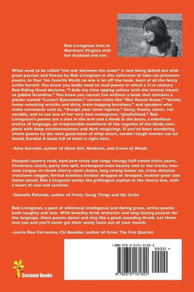 What used to be called "the war between the sexes" is now being duked out with great passion and finesse by Reb Livingston in this collection of take-no-prisoners poems. In Your Ten Favorite Words no one is let off the hook, least of all the feisty scribe herself. Sassy, freaky, comic, vulnerable, and to use her one of her very own neologisms, "gleefullized," Reb Livingston's poems are a shot in the arm and a throb in the brain, a rebellious erotics of language, an irrepressible manifesto of the vagaries of the libido, complete with deep mischievousness and dark misgivings. If you've been wondering where poems by the next generation of whip smart, tender/tough women can be found: Eureka! A book full of them is right here. --Amy Gerstler