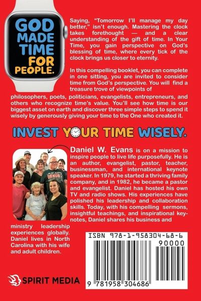 Face it, if you're human you probably struggle with time management, either most of the time or at least some of it. And it's not enough to say, "Tomorrow I'll manage my day better." Mastering the clock takes forethought and effort-and it starts with a clear understanding of the gift of time in the first place. In Your Time, readers gain perspective on God's blessing of time, where with each tick of the timer we move closer to eternity. Lending masterly perspective that reads as flowingly as a conversation with a friend, author, businessman, and pastor Daniel W. Evans breaks down what's really involved in learning to manage and spend our time with intentionality. From issues of time-control, tools to monitor time, setting priorities, investing time, and learning to give the gift of ours, Evans' message is simple and direct: our earthly time is limited, and only God knows how much of the irreplaceable asset we have left. So we must invest it well! Because if we don't decide how we'll spend it, other people will. Learn from the bite-sized wisdom of history's brightest minds-philosophers, poets, world leaders, evangelists, and entrepreneurs, with a profound sense of its value. As Steve Jobs said, "It's really clear that the most precious resource we all have is time." In this concise and compelling booklet-one that takes no more than a single sit-down to complete-the reader is invited to consider time from a Scriptural perspective. And they're shown an easy formula to manage it, what Evans calls "the ABC's of investing time." One critical takeaway: time is undoubtedly our greatest asset on planet Earth, a gift created by God. And with a little consideration and planning, we can learn to spend it wisely, give it away generously, and thrive.