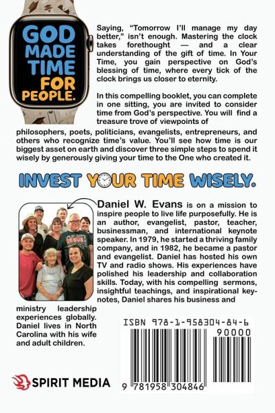 Face it, if you're human you probably struggle with time management, either most of the time or at least some of it. And it's not enough to say, "Tomorrow I'll manage my day better." Mastering the clock takes forethought and effort-and it starts with a clear understanding of the gift of time in the first place. In Your Time, readers gain perspective on God's blessing of time, where with each tick of the timer we move closer to eternity. Lending masterly perspective that reads as flowingly as a conversation with a friend, author, businessman, and pastor Daniel W. Evans breaks down what's really involved in learning to manage and spend our time with intentionality. From issues of time-control, tools to monitor time, setting priorities, investing time, and learning to give the gift of ours, Evans' message is simple and direct: our earthly time is limited, and only God knows how much of the irreplaceable asset we have left. So we must invest it well! Because if we don't decide how we'll spend it, other people will. Learn from the bite-sized wisdom of history's brightest minds-philosophers, poets, world leaders, evangelists, and entrepreneurs, with a profound sense of its value. As Steve Jobs said, "It's really clear that the most precious resource we all have is time." In this concise and compelling booklet-one that takes no more than a single sit-down to complete-the reader is invited to consider time from a Scriptural perspective. And they're shown an easy formula to manage it, what Evans calls "the ABC's of investing time." One critical takeaway: time is undoubtedly our greatest asset on planet Earth, a gift created by God. And with a little consideration and planning, we can learn to spend it wisely, give it away generously, and thrive.