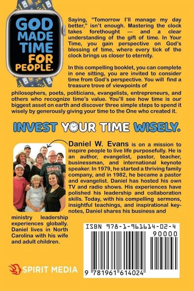 Face it, if you're human you probably struggle with time management, either most of the time or at least some of it. And it's not enough to say, "Tomorrow I'll manage my day better." Mastering the clock takes forethought and effort-and it starts with a clear understanding of the gift of time in the first place. In Your Time, readers gain perspective on God's blessing of time, where with each tick of the timer we move closer to eternity. Lending masterly perspective that reads as flowingly as a conversation with a friend, author, businessman, and pastor Daniel W. Evans breaks down what's really involved in learning to manage and spend our time with intentionality. From issues of time-control, tools to monitor time, setting priorities, investing time, and learning to give the gift of ours, Evans' message is simple and direct: our earthly time is limited, and only God knows how much of the irreplaceable asset we have left. So we must invest it well! Because if we don't decide how we'll spend it, other people will. Learn from the bite-sized wisdom of history's brightest minds-philosophers, poets, world leaders, evangelists, and entrepreneurs, with a profound sense of its value. As Steve Jobs said, "It's really clear that the most precious resource we all have is time." In this concise and compelling booklet-one that takes no more than a single sit-down to complete-the reader is invited to consider time from a Scriptural perspective. And they're shown an easy formula to manage it, what Evans calls "the ABC's of investing time." One critical takeaway: time is undoubtedly our greatest asset on planet Earth, a gift created by God. And with a little consideration and planning, we can learn to spend it wisely, give it away generously, and thrive.