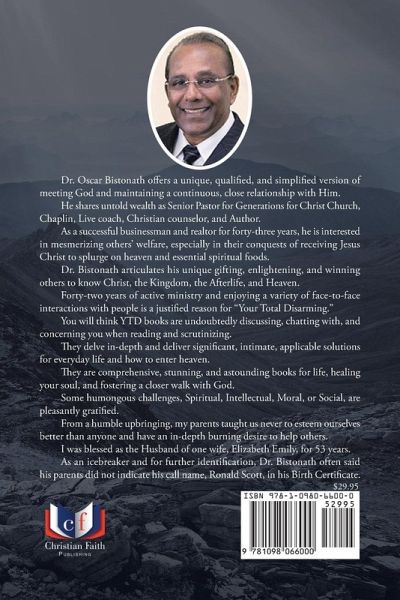 Dr. Oscar Bistonath offers a unique, qualified, and simplified version of meeting God and maintaining a continuous, close relationship with Him. He shares untold wealth as Senior Pastor for Generations for Christ Church, Chaplin, Live coach, Christian counselor, and Author. As a successful businessman and realtor for forty-three years, he is interested in mesmerizing others' welfare, especially in their conquests of receiving Jesus Christ to splurge on heaven and essential spiritual foods. Dr. Bistonath articulates his unique gifting, enlightening, and winning others to know Christ, the Kingdom, the Afterlife, and Heaven. Forty-two years of active ministry and enjoying a variety of face-to-face interactions with people is a justified reason for "Your Total Disarming." You will think YTD books are undoubtedly discussing, chatting with, and concerning you when reading and scrutinizing. They delve in-depth and deliver significant, intimate, applicable solutions for everyday life and how to enter heaven. They are comprehensive, stunning, and astounding books for life, healing your soul, and fostering a closer walk with God. Some humongous challenges, Spiritual, Intellectual, Moral, or Social, are pleasantly gratified. From a humble upbringing, my parents taught us never to esteem ourselves better than anyone and have an in-depth burning desire to help others. I was blessed as the Husband of one wife, Elizabeth Emily, for 53 years. As an icebreaker and for further identification, Dr. Bistonath often said his parents did not indicate his call name, Ronald Scott, in his Birth Certificate.