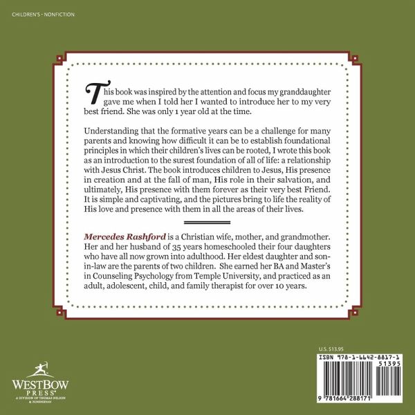 This book was inspired by the attention and focus my granddaughter gave me when I told her I wanted to introduce her to my very best friend. She was only 1 year old at the time. Understanding that these formative years can be a challenge for many parents and that there can be at times a loss as to what to teach our children and how to establish foundational principles in which their lives can be rooted, I wrote this book as an introduction to the surest foundation of all of life: a relationship with Jesus Christ. The book introduces Christ to children, His presence in creation and at the fall, His role in their salvation and ultimately His presence with them forever as their very best Friend. It is simple and captivating and the pictures bring to life His forever love and presence in all areas of their lives.
