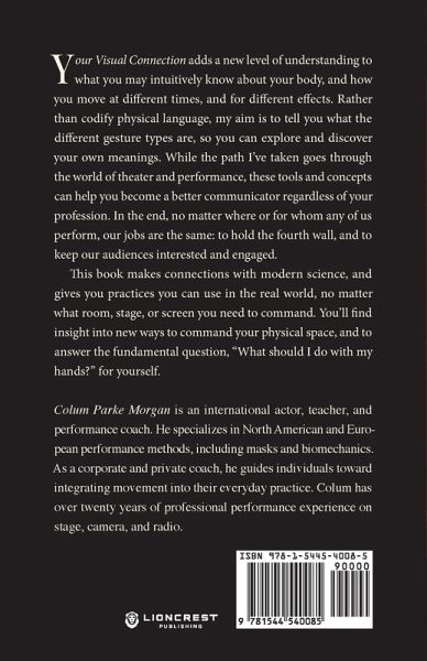 You communicate through more than just your words. Your body shares the meaning of your ideas, especially the gestures you use while speaking. Whether you are a business professional, artist, or student, anyone can benefit from tapping into the power of the six gestures types. In Your Visual Connection: Six Gesture Types for Holding the Fourth Wall, Colum Parke Morgan draws from performance practices, biomechanics, and modern science to teach you how to hold "the fourth wall" and keep your audience engaged. He defines the six gesture types and how they can empower your communication whether you are on camera, in a meeting, or addressing an auditorium. Your Visual Connection is a user's manual for your body. Once you unlock the power of your gestures, you become an effective communicator no matter what "stage" you perform on.