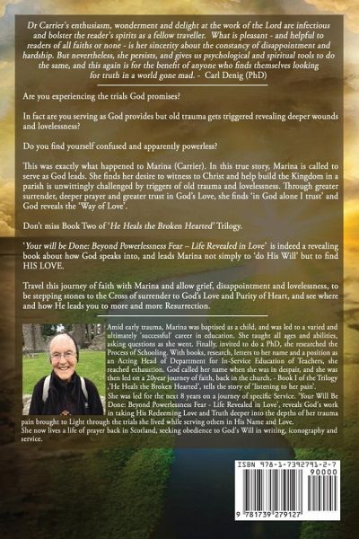Are you living the 'trials' we are promised while serving for God? Does your service in God's Kingdom bring dark to the Light? This was exactly what happened to Marina (Carrier). In this true story, Marina is called to serve as God leads. She finds her desire to witness to Christ in a Parish, in willing obedience, is unwittingly challenged by triggers of old trauma and lovelessness. Through greater surrender, deeper prayer and greater trust in God's Love, she finds 'in God alone I trust' and God reveals the 'Way of Love'. Don't miss Book Two of 'He Heals the Broken Hearted' Trilogy. 'Your will be Done; Beyond Powerlessness Fear - Life Revealed in Love' is indeed a revealing book about how God speaks into, and leads Marina not simply to 'do His Will' but to find HIS LOVE. Travel this journey of faith with Marina and allow grief, disappointment, powerlessness, fear and lovelessness, to be stepping stones to the Cross of surrender to God's Love and Purity of Heart, and see where and how He leads you to more and more Resurrection and clarity of purpose in faith, hope and love.