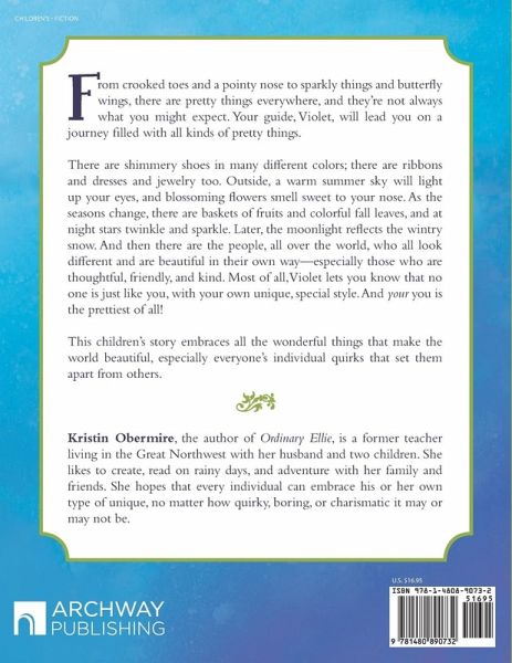From crooked toes and a pointy nose to sparkly things and butterfly wings, there are pretty things everywhere, and they're not always what you might expect. Your guide, Violet, will lead you on a journey filled with all kinds of pretty things. There are shimmery shoes in many different colors; there are ribbons and dresses and jewelry too. Outside, a warm summer sky will light up your eyes, and blossoming flowers smell sweet to your nose. As the seasons change, there are baskets of fruits and colorful fall leaves, and at night stars twinkle and sparkle. Later, the moonlight reflects the wintry snow. And then there are the people, all over the world, who all look different and are beautiful in their own way-especially those who are thoughtful, friendly, and kind. Most of all, Violet lets you know that no one is just like you, with your own unique, special style. And your you is the prettiest of all! This children's story embraces all the wonderful things that make the world beautiful, especially everyone's individual quirks that set them apart from others.