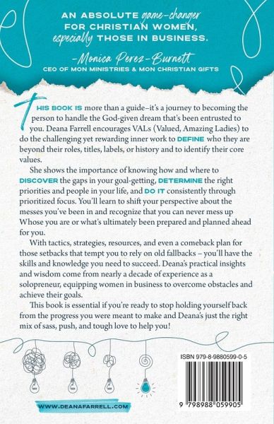 This book is more than a guide-it's a journey to becoming the person to handle the God-given dream that's been entrusted to you. Deana Farrell encourages VALs (Valued, Amazing Ladies) to do the challenging yet rewarding inner work to DEFINE who they are beyond their roles, titles, labels, or history and to identify their core values. She shows the importance of knowing how and where to DISCOVER the gaps in your goal-getting, DETERMINE the right priorities and people in your life, and DO IT consistently through prioritized focus. You'll learn to shift your perspective about the messes you've been in and recognize that you can never mess up Whose you are or what's ultimately been prepared and planned ahead for you. With tactics, strategies, resources, and even a comeback plan for those setbacks that tempt you to rely on old fallbacks - you'll have the skills and knowledge you need to succeed. Deana's practical insights and wisdom come from nearly a decade of experience as a solopreneur, equipping women in business to overcome obstacles and achieve their goals.
