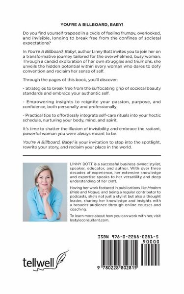 YOU'RE A BILLBOARD, BABY! Do you find yourself trapped in a cycle of feeling frumpy, overlooked, and invisible, longing to break free from the confines of societal expectations? In You're A Billboard, Baby!, author Linny Bott invites you to join her on a transformative journey tailored for the overwhelmed, busy woman. Through a candid exploration of her own struggles and triumphs, she unveils the hidden potential within every woman who dares to defy convention and reclaim her sense of self. Through the pages of this book, you'll discover: - Strategies to break free from the suffocating grip of societal beauty standards and embrace your authentic self. - Empowering insights to reignite your passion, purpose, and confidence, both personally and professionally. - Practical tips to effortlessly integrate self-care rituals into your hectic schedule, nurturing your body, mind, and spirit. It's time to shatter the illusion of invisibility and embrace the radiant, powerful woman you were always meant to be. You're A Billboard, Baby! is your invitation to step into the spotlight, rewrite your story, and reclaim your place in the world.