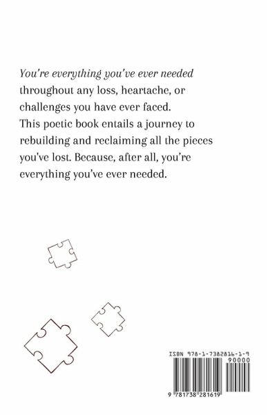 In a world where our voices are often silenced, 'You're everything you've ever needed' breaks through the barriers diving into reclaiming broken pieces, rebuilding, and finding clarity and connection from within. It's a powerful journey of healing and growth. 'You're Everything You've Ever Needed' is a transformative guide to reclaiming your inner strength. It's a powerful journey of self-discovery and empowerment. This book is not just a collection of quotes and poetry, but a celebration of the strength, resilience, and beauty that lies within. It serves as a reminder that we are lovable, heard, seen, and deserving of love and respect.