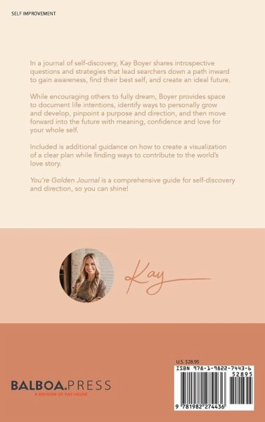 In a journal of self-discovery, Kay Boyer shares introspective questions and strategies that lead searchers down a path inward to gain self-awareness, find their best self, and create an ideal future. While encouraging others to fully dream, Boyer provides space to document life intentions, identify ways to personally grow and develop, pinpoint a purpose and direction, and then move forward into the future with meaning, confidence and love for your whole self. Included is additional guidance on how to create a visualization of a clear plan while finding ways to contribute to the world's love story. You're Golden Journal is a comprehensive guide for self-discovery and direction, so you can shine!