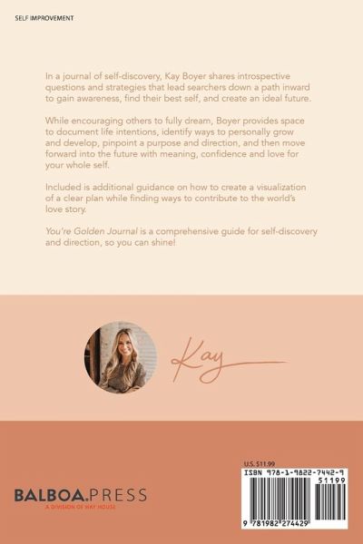 In a journal of self-discovery, Kay Boyer shares introspective questions and strategies that lead searchers down a path inward to gain self-awareness, find their best self, and create an ideal future. While encouraging others to fully dream, Boyer provides space to document life intentions, identify ways to personally grow and develop, pinpoint a purpose and direction, and then move forward into the future with meaning, confidence and love for your whole self. Included is additional guidance on how to create a visualization of a clear plan while finding ways to contribute to the world's love story. You're Golden Journal is a comprehensive guide for self-discovery and direction, so you can shine!