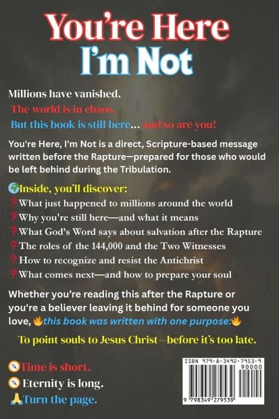 You're Here, I'm Not!What You Need to Know to Be Saved During the Tribulation You're Here, I'm Not is a short, urgent, and powerfully clear book written specifically for those left behind after the Rapture. Based on the authority of the 1611 King James Bible and rightly divided truth, this book explains what just happened, what comes next, and-most importantly-how to be saved during the Tribulation. Written April 2025, (before the Rapture), this message was prepared in advance for a world that rejected the truth but now sees it unfolding in real time. It's not speculation. It's Scripture. In eight concise chapters, the reader will discover:What the Bible says about the Rapture Why the Church is gone-and what changed How salvation during the Tribulation is faith + works The ministry of the 144,000 and the Two Witnesses The mark of the beast and the danger of taking it What judgments are coming next The Second Coming, the Millennium, and the Great White Throne Judgment One final plea: It's not too late-yet This book is also a resource for born-again believers today, who want to leave behind a witness for loved ones. Keep a copy in your home, give one to a friend, or tuck it in your Bible. After the Rapture, it may be the voice that leads someone to Christ.