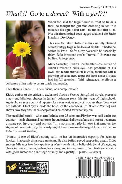 What?!! Go to a dance? With a girl?!! When the large flower appeared in front of Julian's face, he thought the girl was checking to see if it matched his light blond hair-he ran into that a lot. Not this time: he had been tagged to attend the Sadie Hawkins Day Dance. This was the latest obstacle in his secret strategy to gain the love of his life. It had to be secret: in 1962, life for a gay boy could be especially risky. Rule 1: Pretend you're normal; rule 2: Evade the bullies; rule 3: Keep busy. Mark Schaefer, Julian's scoutmaster-the center of Julian's romantic bulls eye-had problems of his own. His recent promotion at work, combined with a growing personal need to get out from under his past, had his full attention. With reluctance, he allows a colleague of his wife to be his guide and mentor. Then there's Randall... a new friend or a complication? Eldot, author of the critically acclaimed Julian's Private Scrapbook novels, presents a new and hilarious chapter in Julian's poignant story: his first year of high school. Again, he weaves a comical tapestry for a very serious subject: who are these boys who get bullied? Eldot gets inside the heads of the characters and shows how they should be accepted and celebrated for who they are. "Humor is one of Eldot's strong suits; he has an impressive capacity for penning farcical, innocently disastrous moments." [Kirkus] The pre-digital world-when a milkshake cost 25 cents and Playboy was sold under the counter-lends charm to the subject and allows a frank and honest treatment of same sex discovery and activity. "Well-written, with engaging, likable characters, this book skillfully presents the challenges and pleasures boys who love men face in growing up." [BlueInk]