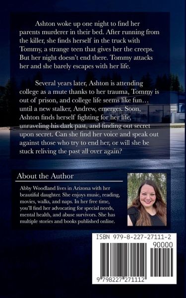 Ashton woke up one night to find her parents murderer in their bed. After running from the killer, she finds herself in the truck with Tommy, a strange teen that gives her the creeps. But her night doesn't end there. Tommy attacks her and she barely escapes with her life. Several years later, Ashton is attending college as a mute thanks to her trauma, Tommy is out of prison, and college life seems like fun... until a new stalker, Andrew, emerges. Soon, Ashton finds herself fighting for her life, unraveling his dark past, and finding out secret upon secret. Can she find her voice and speak out against those who try to end her, or will she be stuck reliving the past all over again?