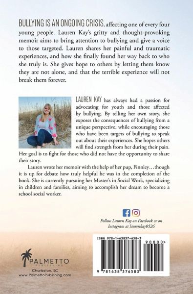 Bullying is an ongoing crisis across the nation, affecting one out of every four young people. Lauren Kay's gritty and thought-provoking memoir aims to bring attention to bullying and open the door for those who are or have been targeted to gain a voice. Dive into Lauren's story as she shares her painful experiences from the relentless bullying she endured during her school years, and how she found her way back to who she truly is in her young adult years. As she discovered how her faith could play a role in her journey toward healing and her ability to make sense of her trauma, she uncovered the real truth of what it means to love yourself, and how powerful a being you can be if you make that difficult but empowering choice. She gives hope to victims of bullying by letting them know they are not alone, and that the terrible experience will not break them forever, but rather strengthen them into who they were always meant to be. Youth, young adults, and parents, and mental health professionals alike will find this book inspiring and educational.