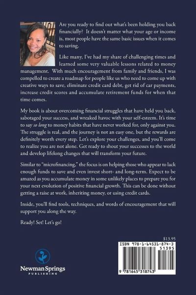 Are you ready to find out what's been holding you back financially? It doesn't matter what your age or income is, most people have the same basic issues when it comes to saving. Like many, I've had my share of challenging times and learned some very valuable lessons related to money management. With much encouragement from family and friends, I was compelled to create a roadmap for people like us who need to come up with creative ways to save, eliminate credit card debt, get rid of car payments, increase credit scores and accumulate retirement funds for when that time comes. My book is about overcoming financial struggles that have held you back, sabotaged your success, and wreaked havoc with your self-esteem. It’s time to say so long to money habits that have never worked for, only against you. The struggle is real, and the journey is not an easy one, but the rewards are definitely worth every step. Let’s explore your challenges, and you’ll come to realize you are not alone. Get ready to shout your successes to the world and develop lifelong changes that will transform your future. Similar to "microfinancing," the focus is on helping those who appear to lack enough funds to save and even invest short- and long-term. Expect to be amazed as you accumulate money in some unlikely places to prepare you for your next evolution of positive financial growth. This can be done without getting a raise at work, inheriting money, or using credit cards. Inside, you’ll find tools, techniques, and words of encouragement that will support you along the way. Ready! Set! Let’s go!