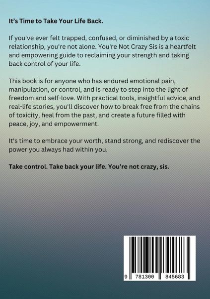 It's Time to Take Your Life Back. If you've ever felt trapped, confused, or diminished by a toxic relationship, you're not alone. You're Not Crazy Sis is a heartfelt and empowering guide to reclaiming your strength and taking back control of your life. This book is for anyone who has endured emotional pain, manipulation, or control, and is ready to step into the light of freedom and self-love. With practical tools, insightful advice, and real-life stories, you'll discover how to break free from the chains of toxicity, heal from the past, and create a future filled with peace, joy, and empowerment. It's time to embrace your worth, stand strong, and rediscover the power you always had within you. Take control. Take back your life. You're not crazy, sis.