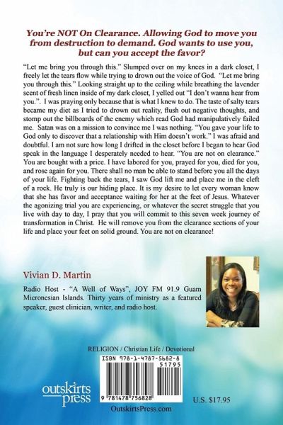 ABOUT Vivian Martin: Over 30 years of experience as Featured Guest Speaker, preaching and teaching the Word of God, Vivian Martin is well known for her command of the scriptures and practical application to a spirit filled life in God. Vivian is an anointed International speaker, both to women and family audiences. She has served as an Elder, Women's Ministry Director, Youth Coordinator, & Disability Ministries Coordinator to name a few. Her God given ministry "A Well of Ways" was revealed to her in 1996 just weeks before the death of her sister & months prior to the death of her best friend. Vivian currently has a daily devotional spotlight on JOY FM91, Guam Micronesian Islands called A Well of Ways. Each chapter in this book is a personal testimony of Vivian's and God's way of speaking to her. Whether you are a Pastor, Women's Leader, church member, or someone searching to know God better, to understand why you are going through the fierce storm in your life, this powerful seven week journey with God will open your eyes to HOPE & PRAISE that you are not on clearance. God always have had a plan for your life. Read below for when the author, Vivian Martin began to realize this: Let me bring you through this. Slumped over on my knees in a dark closet, I freely let the tears flow while trying to drown out the voice of God. Let me bring you through this. Looking straight up to the ceiling while breathing the lavender scent of fresh linen inside of my dark closet, I yelled out " I don't wanna hear from you". I was praying only because that is what I knew to do. The taste of salty tears became my diet as I tried to drown out reality, flush out negative thoughts, and stomp out the bill boards of the enemy which read God had manipulatively failed me. Satan was on a mission to convince me I was nothing. You gave your life to God only to discover that a relationship with Him doesn't work. I was afraid and scared straight. I am not sure how lo