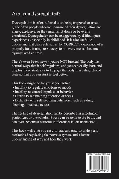 Dysregulation is often referred to as being triggered or upset. Quite often people who are unaware of their dysregulation are angry, explosive, or they might shut down or be overly emotional. Dysregulation can be exaggerated by difficult past experiences - especially in childhood. It is also useful to understand that dysregulation is the CORRECT expression of a properly functioning nervous system - everyone can become dysregulated at times. There's even better news - you're NOT broken! The body has natural ways that it self-regulates, and you can easily learn and employ these strategies to help get the body in a calm, relaxed state so that you can start to feel better. This book might be for you if you notice:Inability to regulate emotions or moods Inability to control impulses or behavior Difficulty maintaining attention or focus Difficulty with self-soothing behaviors, such as eating, sleeping, or substance use The feeling of dysregulation can be described as a feeling of panic, fear, or overwhelm. Stress can be toxic to the body, and can even become a neurotoxin if cortisol is left unchecked. This book will give you easy-to-use, and easy-to-understand methods of regulating the nervous system and a better understanding of why and how they work.