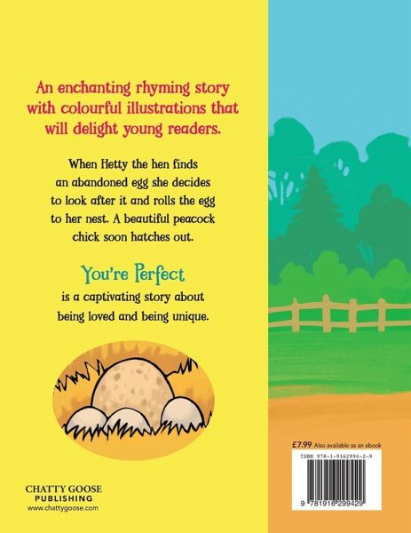 An enchanting rhyming story with colourful illustrations that will delight young readers. You're Perfect is a captivating story about being loved and being unique. Hetty the hen finds a peahen's abandoned egg and decides to kindly look after it and rolls the egg to her nest. The egg is much larger and in fact has a peacock chick growing inside. The rhyming text dances across the page bringing the wonderful characters to life. "When the day came for the chicks to hatch out George flapped up and down and danced all about." The central themes of 'You're Perfect' are love, kindness, family and being unique.