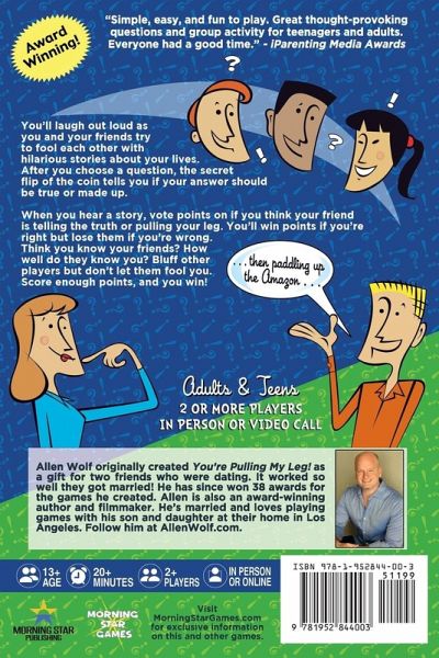 You'll laugh out loud as you and your friends try to fool each other with hilarious stories about your lives as you play this storytelling game. After you choose a question, the secret flip of the coin tells you if your answer should be true or made up. When you hear a story, vote points on if you think your friend is telling the truth or pulling your leg. You'll win points if you're right but lose them if you're wrong. Think you know your friends? How well do they know you? Bluff other players but don't let them fool you. Score enough points, and you win! This game book features cards with over 600 questions and instructions on how to play this game in person or over a video call with two or more people. Winner of 8 Awards! Praise for You're Pulling My Leg!: "Great for new friends. This game makes a terrific icebreaker and getting-to-know-you activity." - REAL SIMPLE MAGAZINE "If you're looking for a party game, this is the best you can find." - THE DICE TOWER "Simple, Easy, and Fun to Play. Great thought-provoking questions. Never became boring. Great group activity for teenagers and adults. Everyone had a good time."- iPARENTING MEDIA AWARDS "Great family, dating, group or party game. Helps you get to know one another better and makes for a lot of laughing. The more you play the more creative your answers will become." - FAMILY GAMES REVIEW "Innovative and refreshingly different. An amazing book with a lot of entertainment and laughs. A sure hit at parties, family gatherings, and when it comes to getting to know friends. The book will definitely bring a smile to the faces of all readers/players. It is a must-have." - READERS' FAVORITE REVIEW