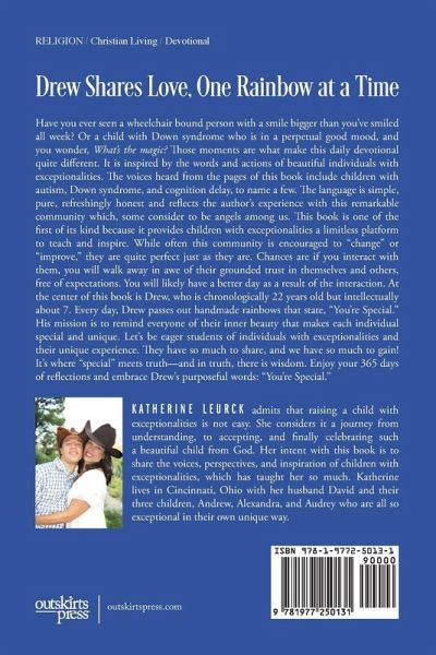 Have you ever seen a wheelchair bound person with a smile bigger than you've smiled all week? Or a child with Down syndrome who is in a perpetual good mood, and you wonder, What's the magic? Those moments are what make this daily devotional quite different. It is inspired by the words and actions of beautiful individuals with exceptionalities. The voices heard from the pages of this book include children with autism, Down syndrome, and cognition delay, to name a few. The language is simple, pure, refreshingly honest and reflects the author's experience with this remarkable community which, some consider to be angels among us. This book is one of the first of its kind because it provides children with exceptionalities a limitless platform to teach and inspire. While often this community is encouraged to "change" or "improve," they are quite perfect just as they are. Chances are if you interact with them, you will walk away in awe of their grounded trust in themselves and others, free of expectations. You will likely have a better day as a result of the interaction. At the center of this book is Drew, who is chronologically 22 years old but intellectually about 7. Every day, Drew passes out handmade rainbows that state, "You're Special."His mission is to remind everyone of their inner beauty that makes each individual special and unique. Let's be eager students of individuals with exceptionalities and their unique experience. They have so much to share, and we have so much to gain! It's where "special" meets truth-and in truth, there is wisdom. Enjoy your 365 days of reflections and embrace Drew's purposeful words: "You're Special."