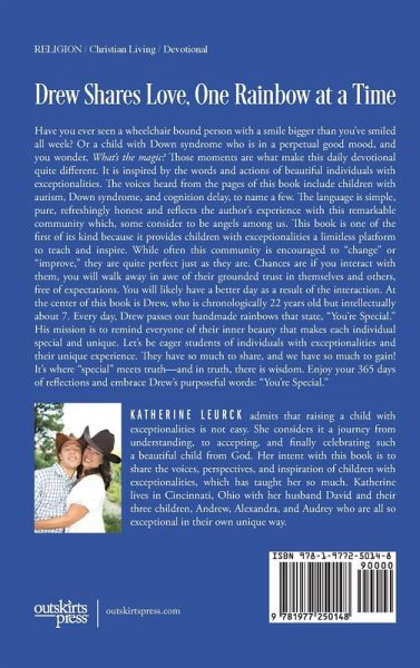 Have you ever seen a wheelchair bound person with a smile bigger than you've smiled all week? Or a child with Down syndrome who is in a perpetual good mood, and you wonder, What's the magic? Those moments are what make this daily devotional quite different. It is inspired by the words and actions of beautiful individuals with exceptionalities. The voices heard from the pages of this book include children with autism, Down syndrome, and cognition delay, to name a few. The language is simple, pure, refreshingly honest and reflects the author's experience with this remarkable community which, some consider to be angels among us. This book is one of the first of its kind because it provides children with exceptionalities a limitless platform to teach and inspire. While often this community is encouraged to "change" or "improve," they are quite perfect just as they are. Chances are if you interact with them, you will walk away in awe of their grounded trust in themselves and others, free of expectations. You will likely have a better day as a result of the interaction. At the center of this book is Drew, who is chronologically 22 years old but intellectually about 7. Every day, Drew passes out handmade rainbows that state, "You're Special."His mission is to remind everyone of their inner beauty that makes each individual special and unique. Let's be eager students of individuals with exceptionalities and their unique experience. They have so much to share, and we have so much to gain! It's where "special" meets truth-and in truth, there is wisdom. Enjoy your 365 days of reflections and embrace Drew's purposeful words: "You're Special."