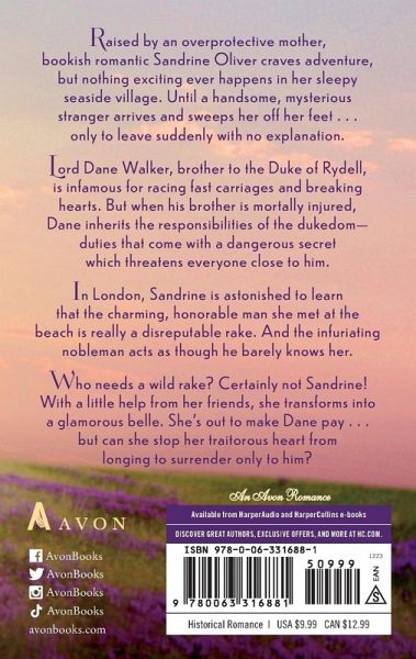 "Raised by an overprotective mother, bookish romantic Sandrine Oliver craves adventure, but nothing exciting ever happens in her sleepy seaside village. Until a handsome, mysterious stranger arrives and sweeps her off her feet...only to leave suddenly with no explanation. Lord Dane Walker, brother to the Duke of Rydell, is infamous for racing fast carriages and breaking hearts. But when his brother is mortally injured, Dane inherits the responsibilities of the dukedom--duties that come with a dangerous secret which threatens everyone close to him. In London, Sandrine is astonished to learn that the charming, honorable man she met at the beach is really a disreputable rake. And the infuriating nobleman acts as though he barely knows her. Who needs a wild rake? Certainly not Sandrine! With a little help from her friends, she transforms into a glamorous belle. She's out to make Dane pay...but can she stop her traitorous heart from longing to surrender only to him?" --